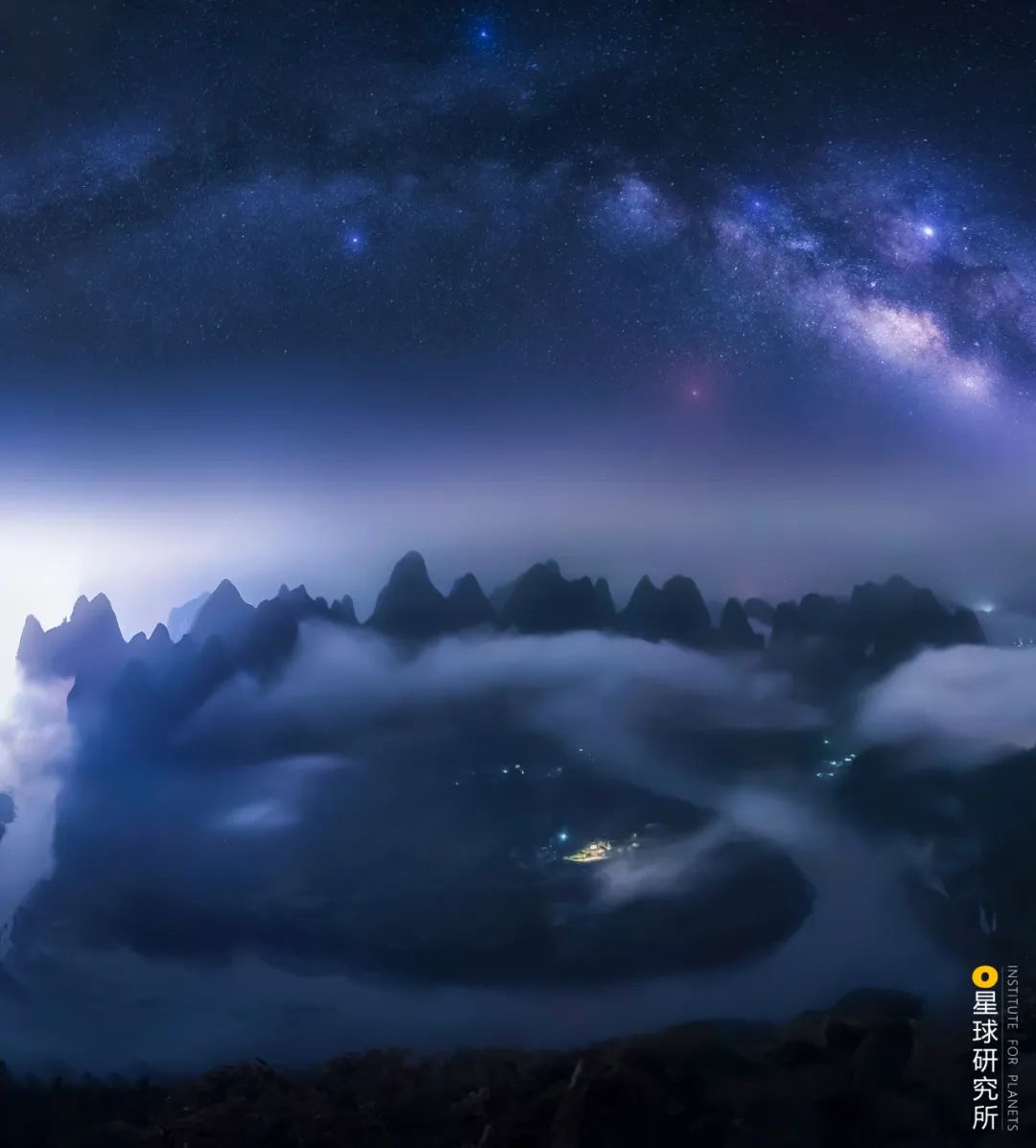 (广西桂林阳朔大面山,山脚下是漓江,银河拱桥横跨喀斯特群峰,摄影师@黄一骏)