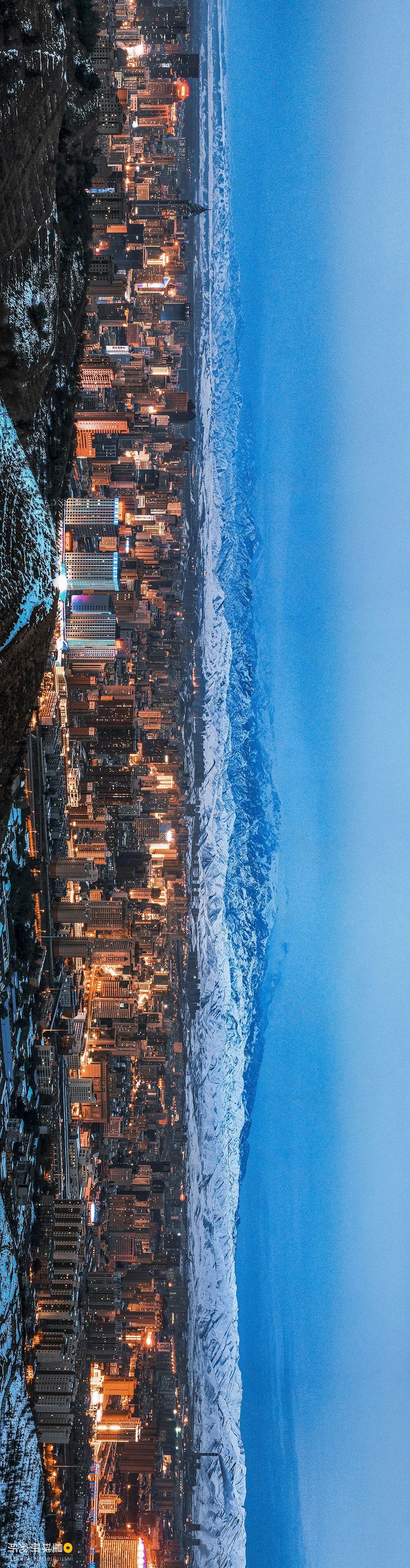 (请横屏观看,从雅玛里克山上俯瞰夜间的乌鲁木齐市区,远处为天山山脉博格达峰,摄影师@刘坤)