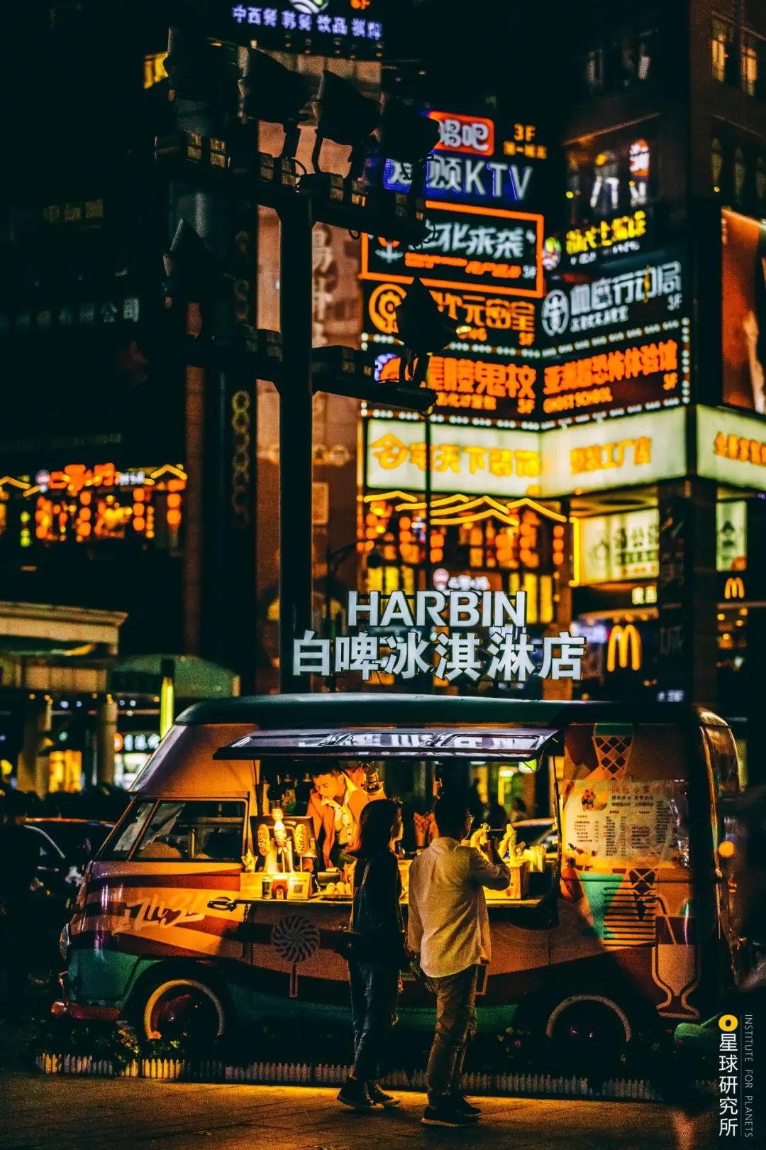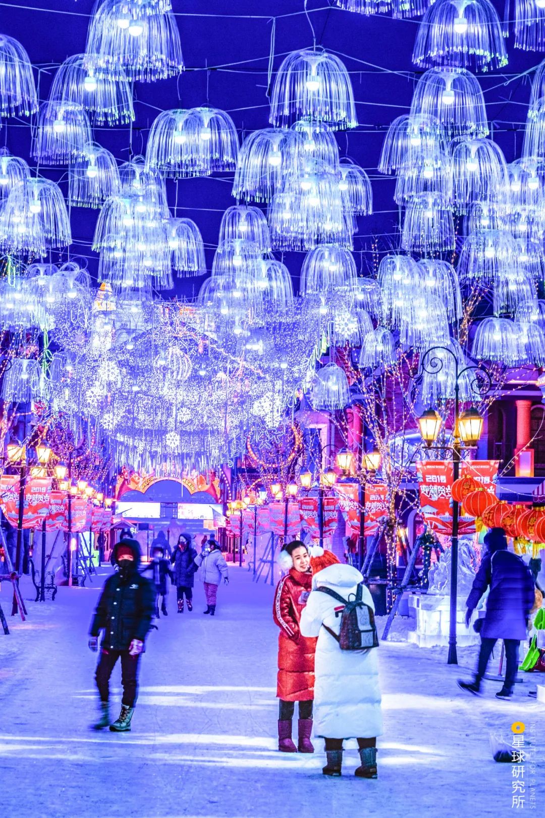 (冬夜的哈尔滨,冰灯装饰着街道,摄影师@戚伟民)