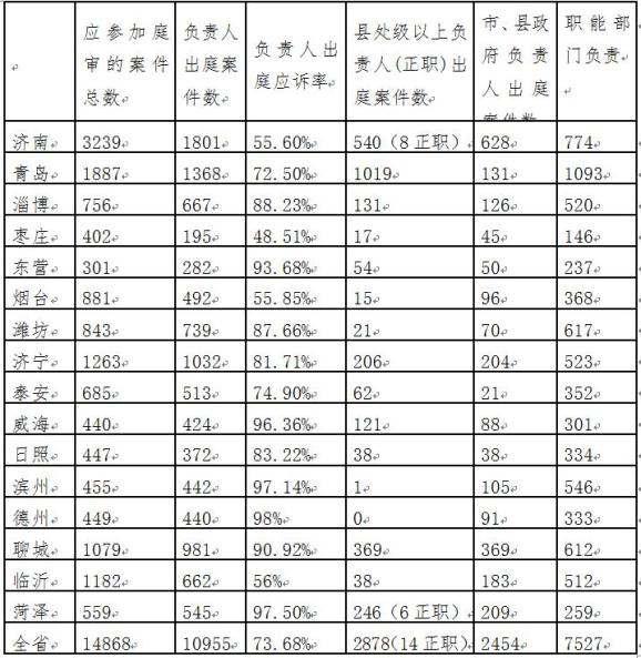 青岛、聊城等市主要领导高度重视行政机关负责人出庭应诉工作。青岛市去年下半年以来行政机关负责人出庭应诉率持续上升,10月份达到100%,12月30日人民法院报头版头条报道了该市的经验做法。聊城市行政机关负责人出庭应诉率从一季度的31.6%,提升到11月份的100%。去年8月份,省法院与省普法办、省司法厅联合出台了《关于推动国家工作人员旁听庭审活动常态化制度化的实施意见》。各级党委政府和法院组织行政机关负责人旁听庭审275次,计12776人次。10月17日,全省万名行政机关负责人视频观摩省法院行政诉讼庭审,范华平副省长亲自旁听并随后作了重要讲话,提出了明确要求。