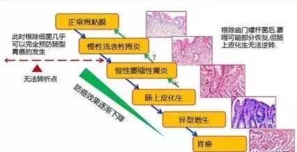 干细胞不正常工作时,从肠化生过渡到胃癌的经历大体是这样:正常胃黏膜→慢性浅表性胃炎→慢性萎缩性胃炎→不完全小肠型肠化→不完全大肠型肠化→异型增生→早期胃癌→进展期胃癌。