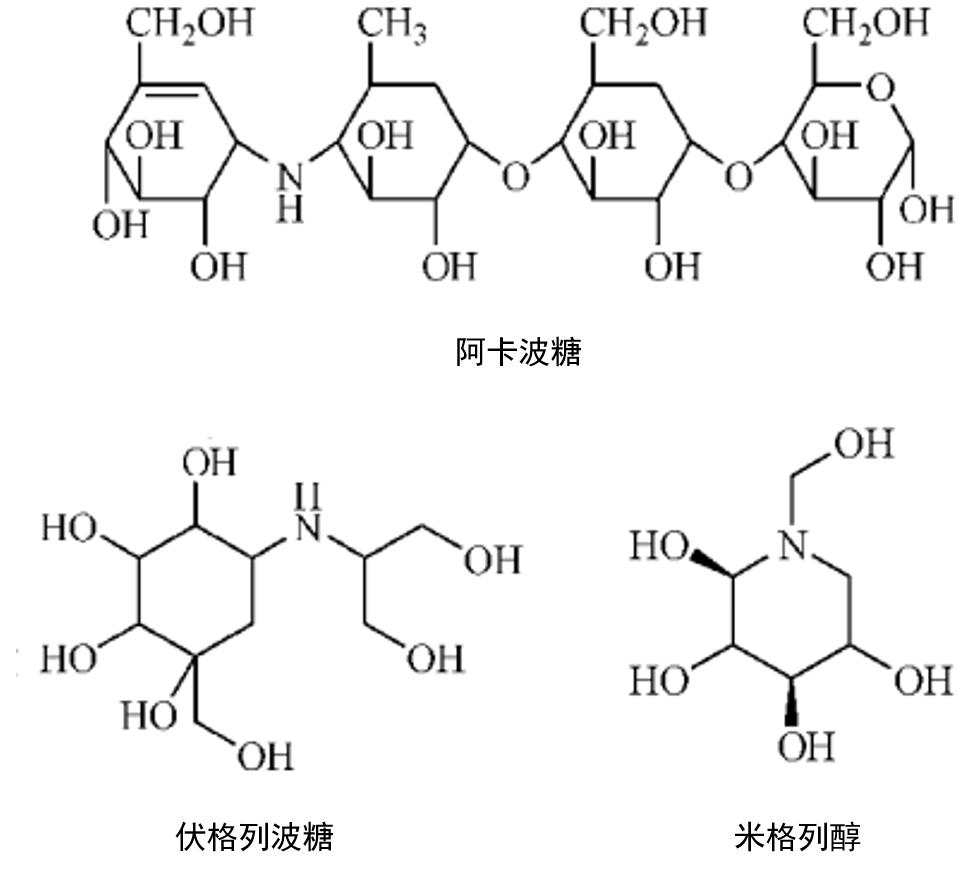 米格列醇显示出减少餐后葡萄糖吸收的优势,可能因为米格列醇与葡萄糖结构相似能够与后者竞争通过相同的小肠上皮转运系统而被吸收[11],但阿卡波糖与伏格列波糖则吸收甚少。