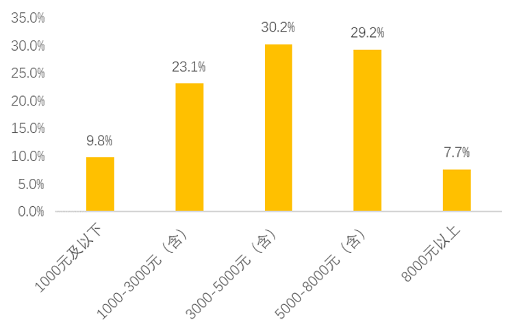△ 2019年美团在职来源于国家建档立卡贫困户的外卖骑手月收入分布,图源:《2019年外卖骑手贫困报告》