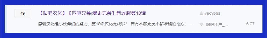 打开四驱兄弟吧,点击精品按钮,稍微往下翻阅,就会发现2020年6月27日的汉化组帖子。