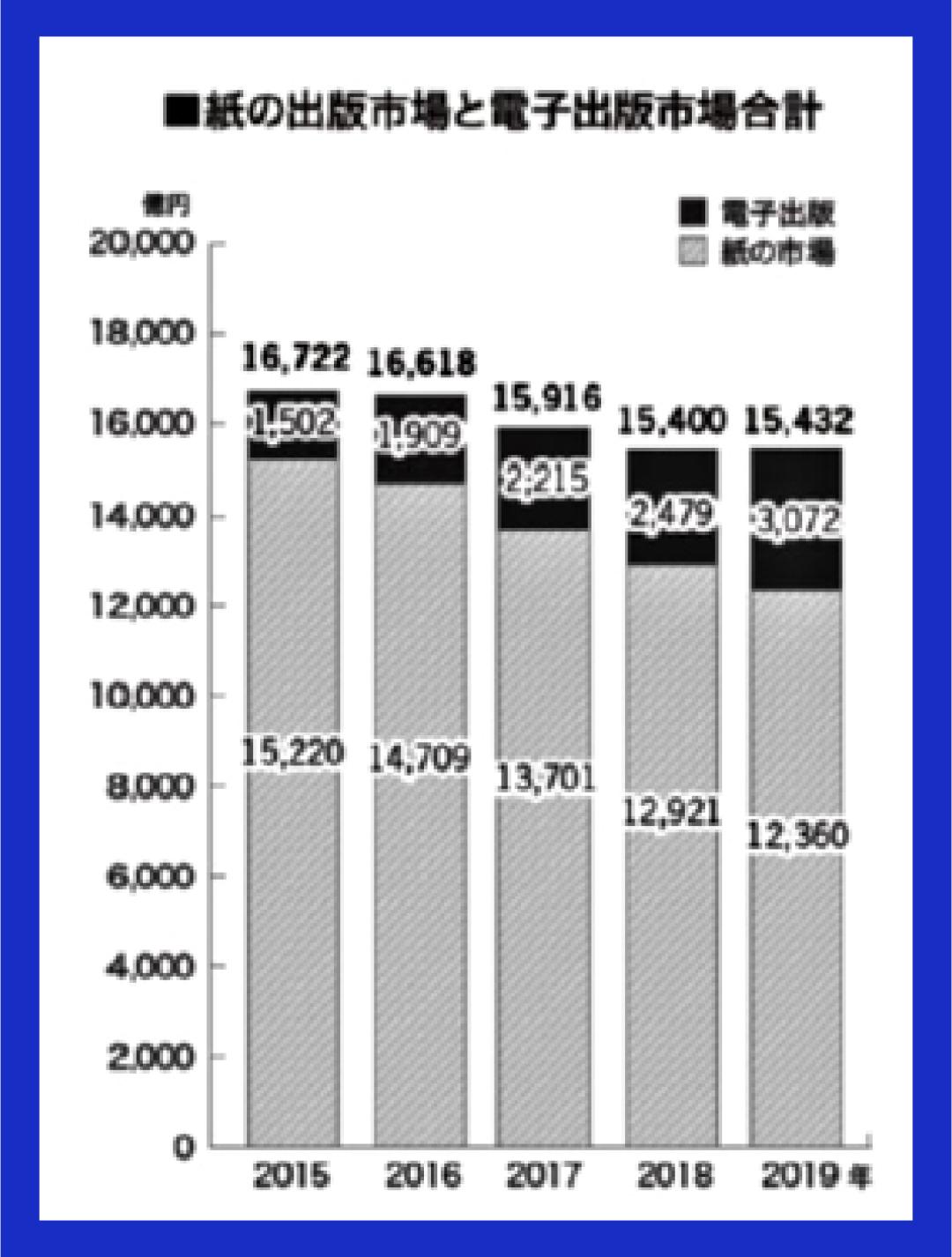 2020年日本全国出版协会公布的专刊《2019年出版物发行和销售概况-2019年电子出版市场报告》显示,整体销售额逐年下降的日本出版市场中,纸质出版物的销售额同比已经连续15年呈现负数。取而代之的是市场份额逐年上升的电子出版市场。