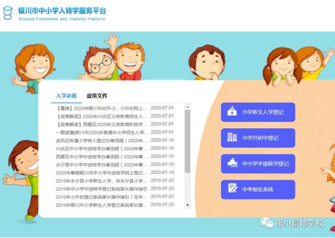 学生报名工作依托银川市中小学入转学服务平台开展。平台网址为:www.ycrxbm.cn