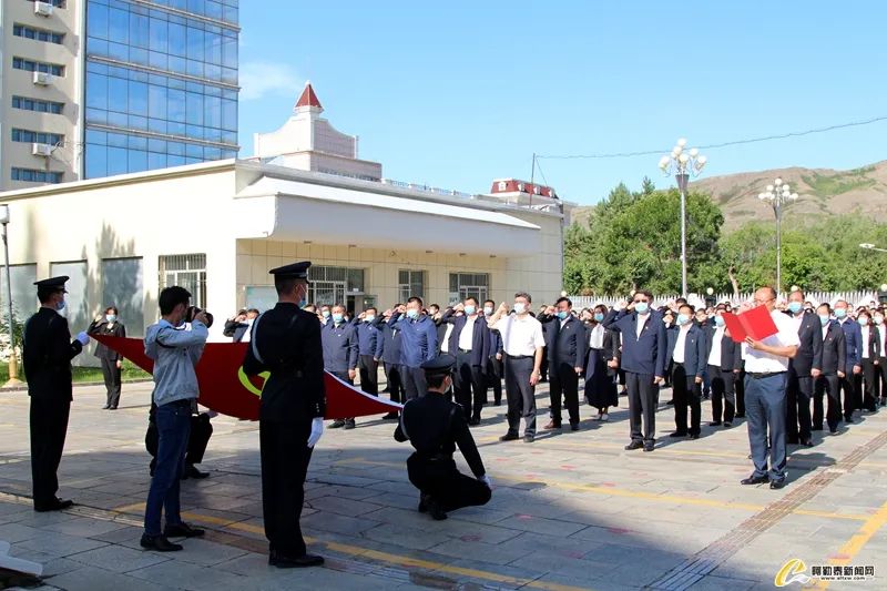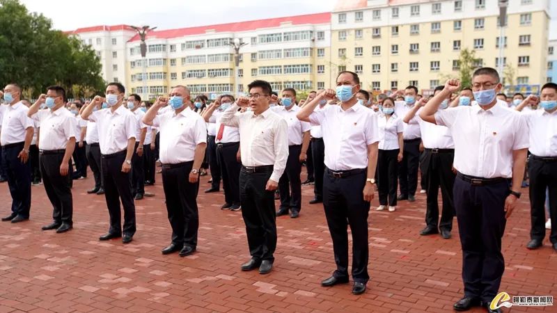 9时30分,礼兵队迈着铿锵有力的步伐,护卫着鲜艳的五星红旗登上国旗台,庄严的《义勇军进行曲》响起,旗手振臂一挥,展旗、敬礼,五星红旗在雄壮的国歌中冉冉升起。随后,全体党员干部面向党旗,举起右拳,庄严宣誓,重温入党誓词。