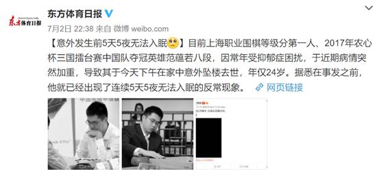 上海市围棋协会7月2日晚发布讣告称,2020年7月2日下午,著名围棋职业棋手范蕴若不幸从家中坠楼身亡,生前被查出患有抑郁症。
