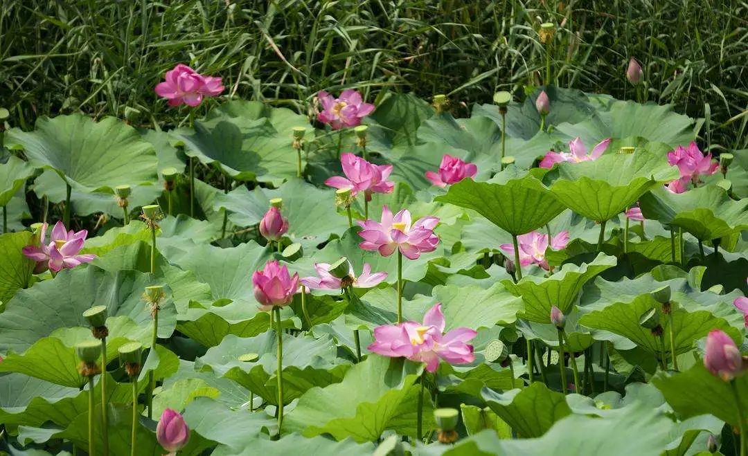 每到盛夏,岸边便生长起一人高的芦苇丛。不远处,荷叶相接,仿佛在湖面之上另有一川翠色的波浪,荷花点缀其间,更显得清秀、洁净。