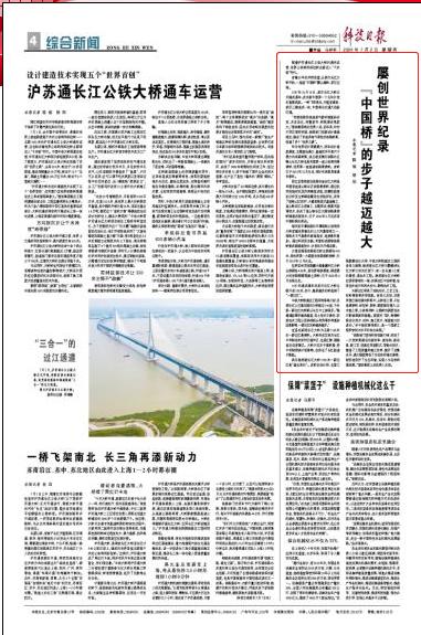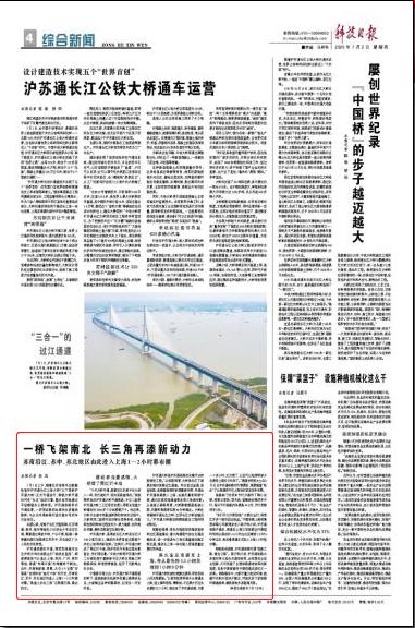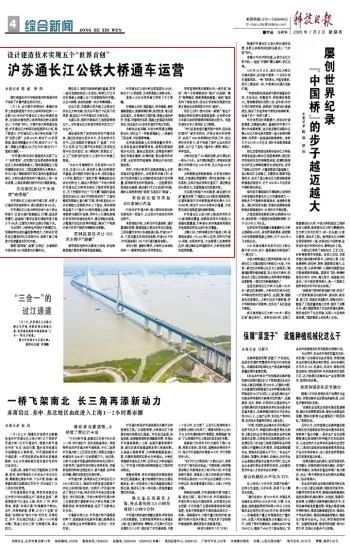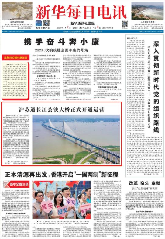 近日,中国中铁设计承建的多项重大工程取得重要进展,受到人民日报、新华社、中央电视台等众多媒体的集中报道,引起社会广泛关注和积极反响。尤其是“7月1日,由中国中铁设计施工的沪苏通长江公铁大桥通车”的新闻分别以《沪苏通长江公铁大桥开通》《一桥飞架南北 加速深度融合》为题,在7月2日出版的《人民日报》头版和要闻版刊发,相关新闻在央视《新闻联播》播出时长达1分29秒。与此同时,央视《新闻联播》还对中老铁路元江双线特大桥合龙、南昌地铁四号线首个双线隧道贯通、重庆铁路枢纽东环线首个站改项目主体工程完工、沪苏通铁路南通西站等重大工程进行了报道。