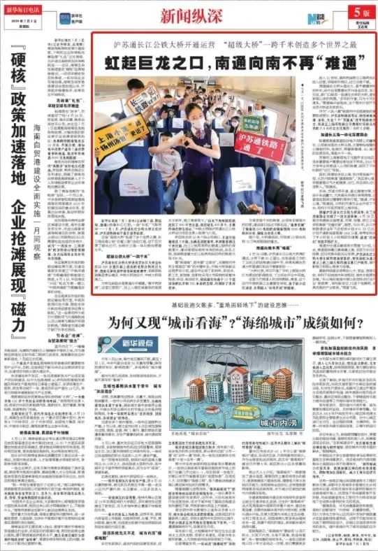 7月1日,由我国自主设计建造、世界上首座主跨为千米级的大桥——沪苏通长江公铁大桥建成,并与沪苏通铁路同步开通运营。沪苏通铁路的开通运营,大幅提高了铁路过江运输能力,缩短了上海与南通及苏北地区的时空距离,将有力助推长江三角洲区域一体化发展。