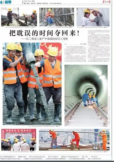 6月的长三角,新冠肺炎疫情的“阴霾”渐渐远去,铁路、公路、地铁等基建项目加快了施工进度。在江苏太仓、浙江杭州和上海等地的工地上,混凝土搅拌机24小时不停运转,桥梁浇筑三班倒昼夜施工,筑基、铺轨、盾构、绑钢筋等工序有序进行,工地上、车间里到处可见农民工忙碌的身影。