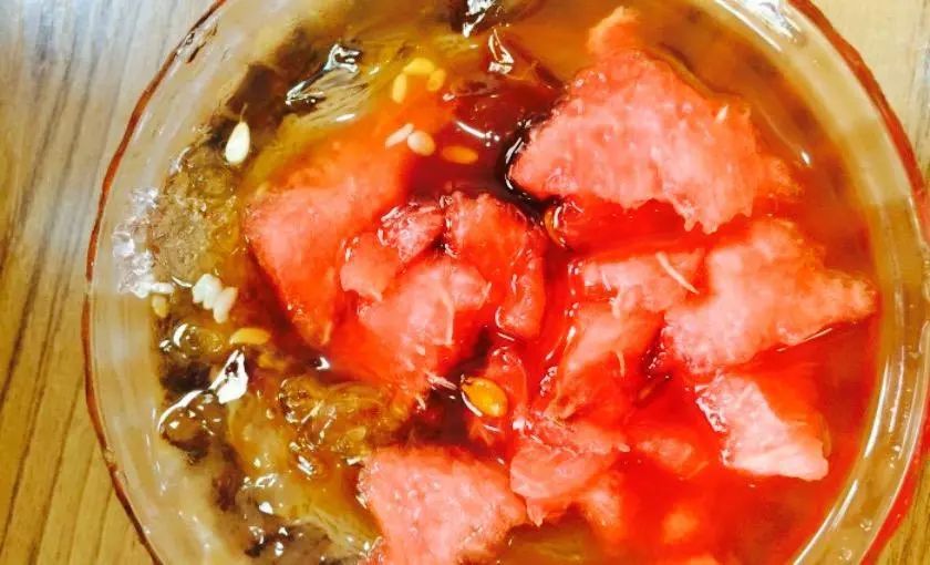 Tips:但并不是冰得越久越好哦,切开的西瓜放入冰箱最好不超过12小时,否则易滋生细菌甚至变质。