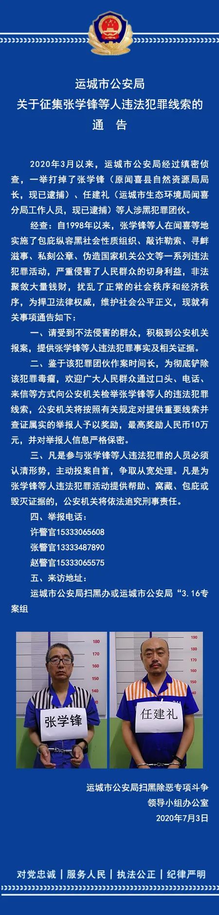 (原题为《运城市公安局关于征集张学锋等人违法犯罪线索的通告》)