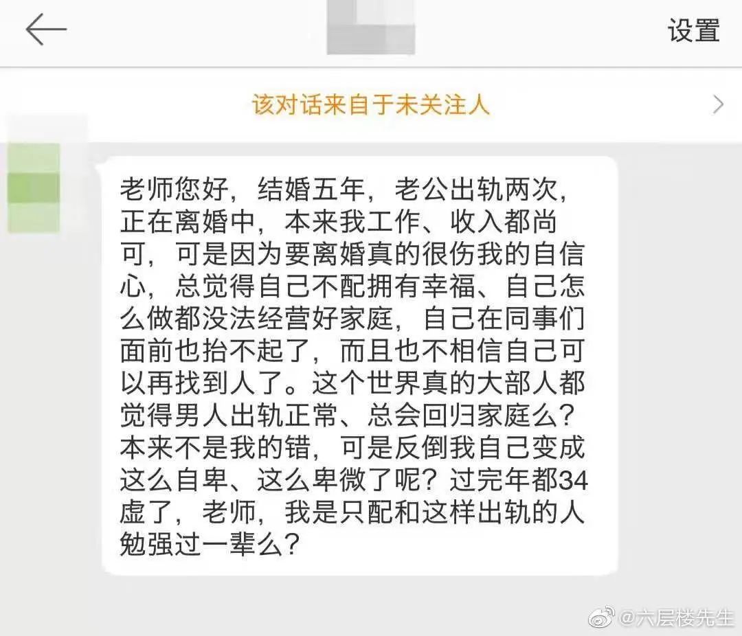 作为万千少女的老棉裤,老六也经常在微博上收到姑娘们的求助信,其中不乏关于伴侣出轨的倾诉,比如「伴侣出轨自己该怎么办?」「如何才能发现伴侣出轨?」或是「伴侣出没出轨医生是不是一眼就能看出来?」等问题。
