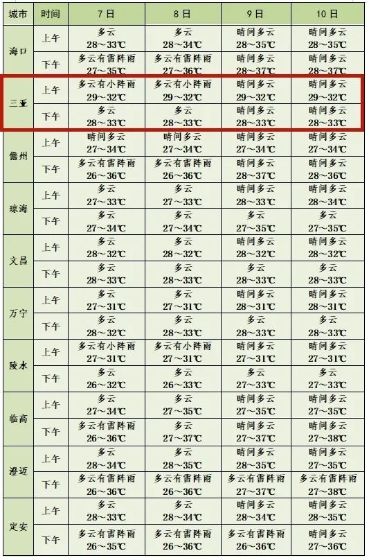 小芒从海南省气象台了解到,预计高考期间(7月7日~10日),各市县城区以多云天气为主,局地有阵雨或雷阵雨,具体预报如下↓↓局地短时降雨对交通有不利影响,请考生们合理安排赶考时间,预祝广大学子考试顺利!