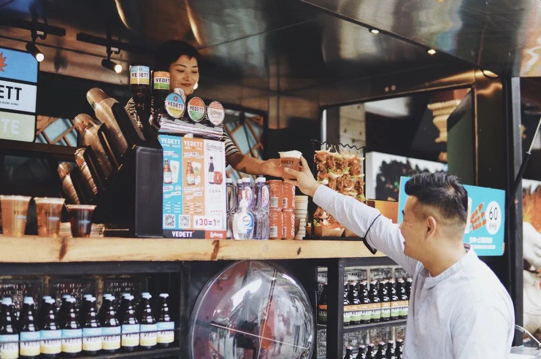中心广场,青岛啤酒的花车就是一个荧光勾勒的移动酒吧。除了零售啤酒,现场也可以机打精酿啤酒,还有好喝的苏打水等软饮出售。