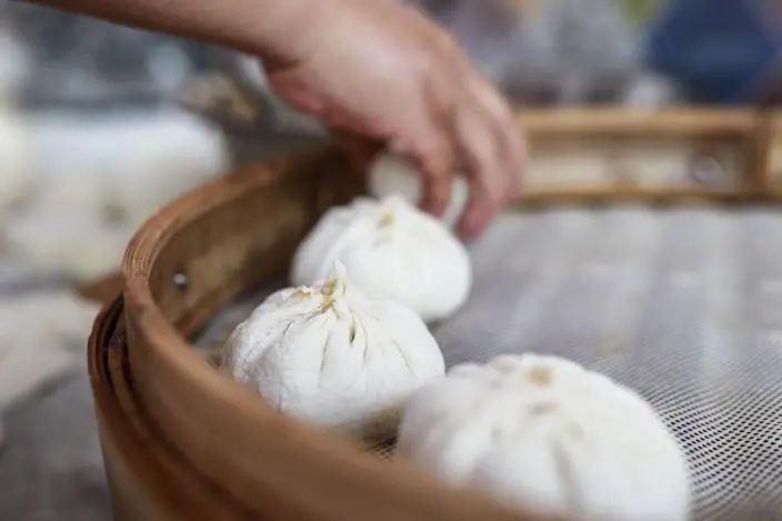 四五厨娘手指翻飞,一个个漂亮的小包子源源不断地从案板送上蒸炉。