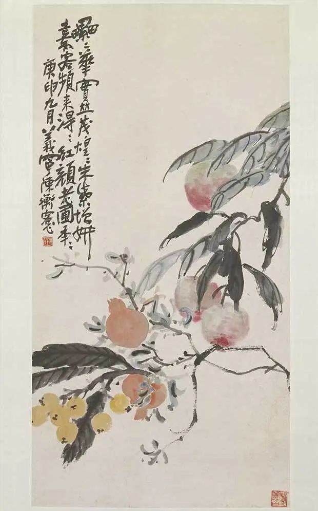 石榴,因为多重吉祥寓意,经常出现在历代画作中。下面,我们就来欣赏一下近代画家陈师曾的《桃榴枇杷图》。