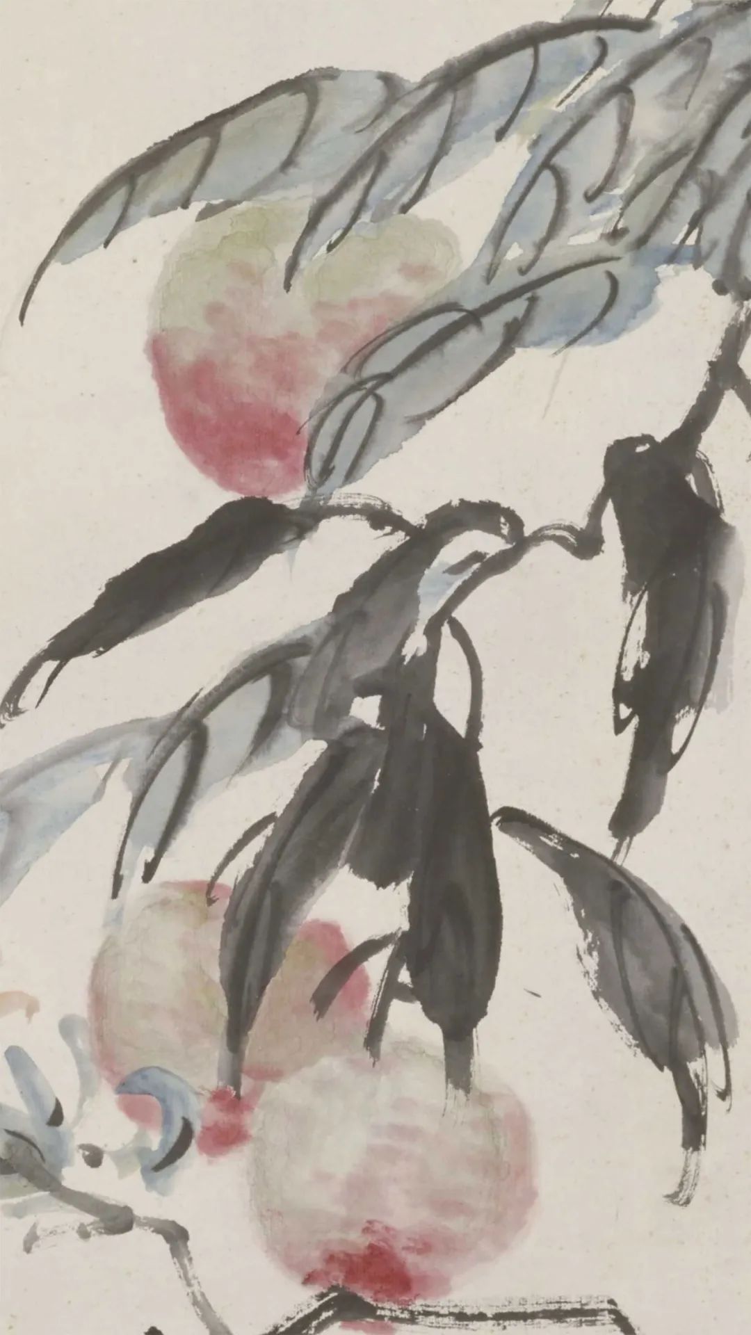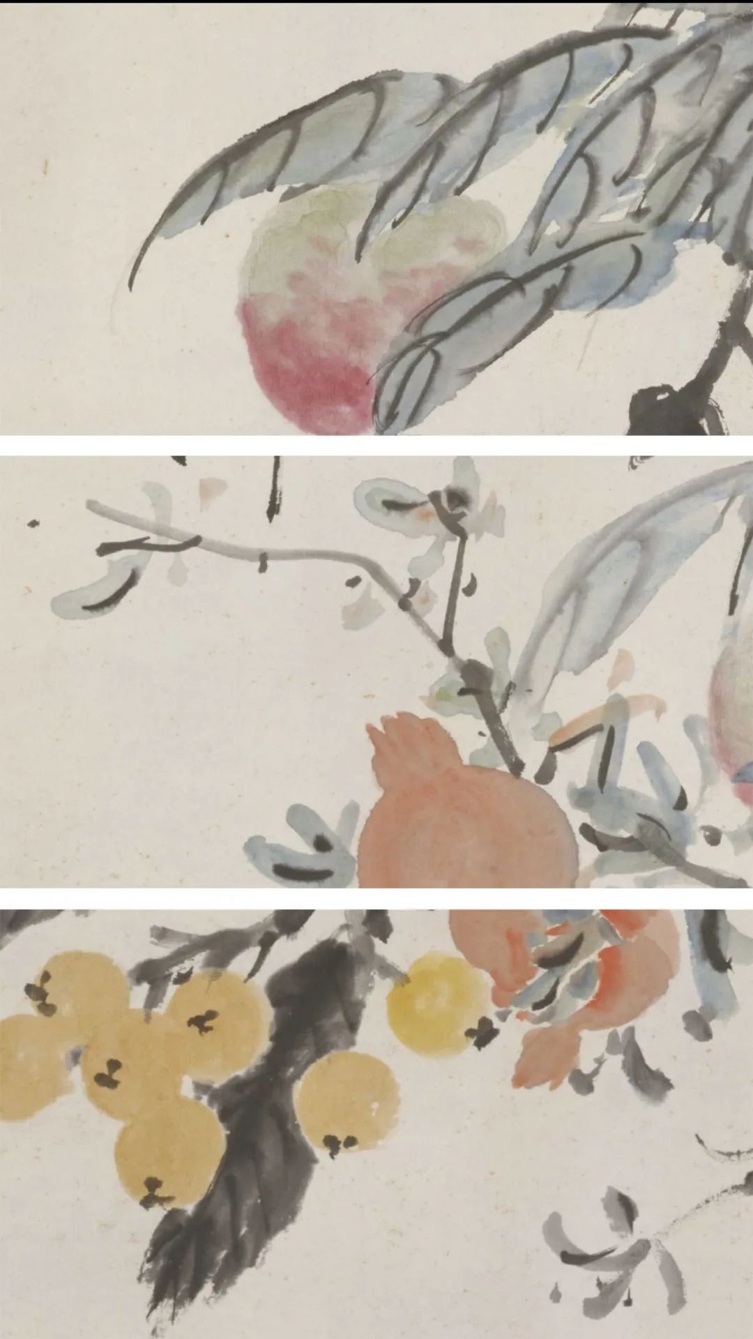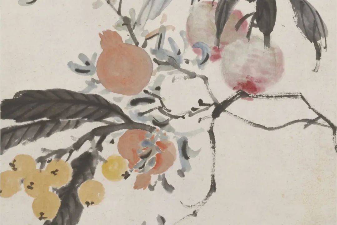 这是一幅大写意绘画,画上有桃、石榴和枇杷各一枝,呈现了累累硕果压低枝头的自然之态。