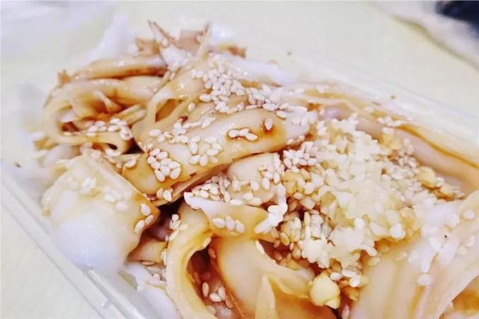 吸满酱汁的粉皮,撒上提味的芝麻和蒜蓉,吃上一口,就忍不住要暴风吸入~