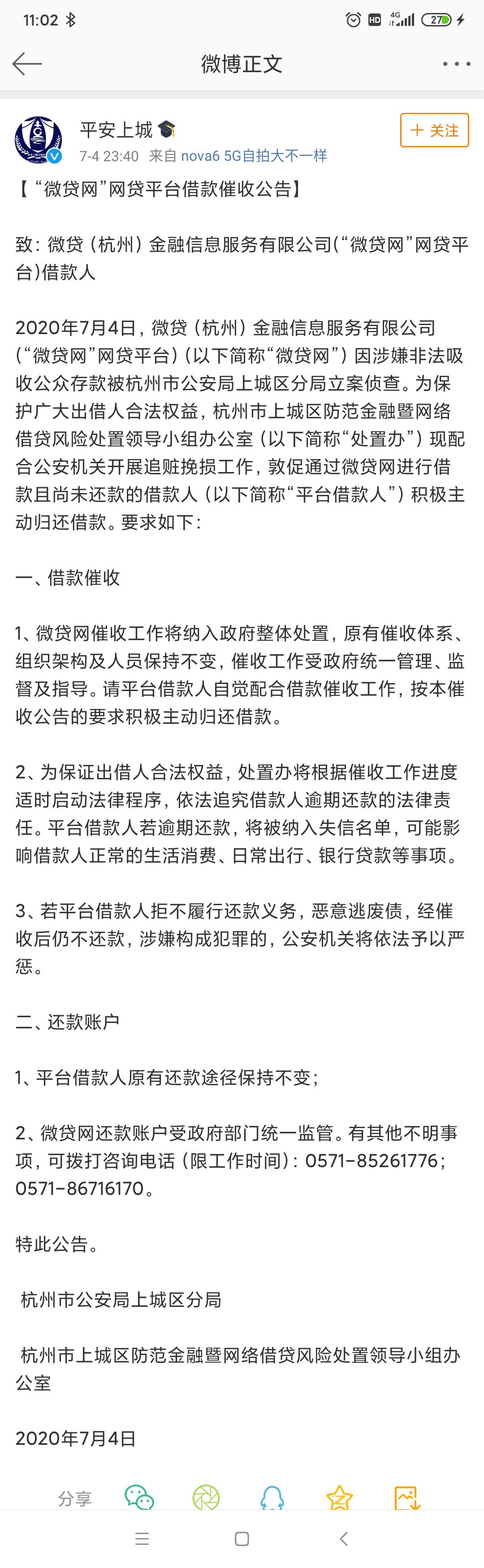仅一个小时后,“平安上城”又发布了“微贷网”网贷平台借款催收公告,表示为保护广大出借人合法权益,杭州市上城区防范金融暨网络借贷风险处置领导小组办公室(以下简称“处置办”)现配合公安机关开展追赃挽损工作,敦促通过微贷网进行借款且尚未还款的借款人(以下简称“平台借款人”)积极主动归还借款。