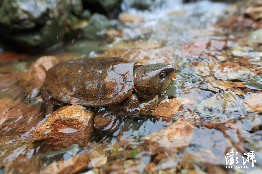 平胸龟,俗名鹰嘴龟。它的头比较大,不能缩入壳内。主要生活于清澈的山涧中,非常罕见。2015年9月,在宁波的四明山高山上,大雨之后,由于溪流水位暴涨,一只平胸龟出现在山村农家附近而被抓获,后被放生。