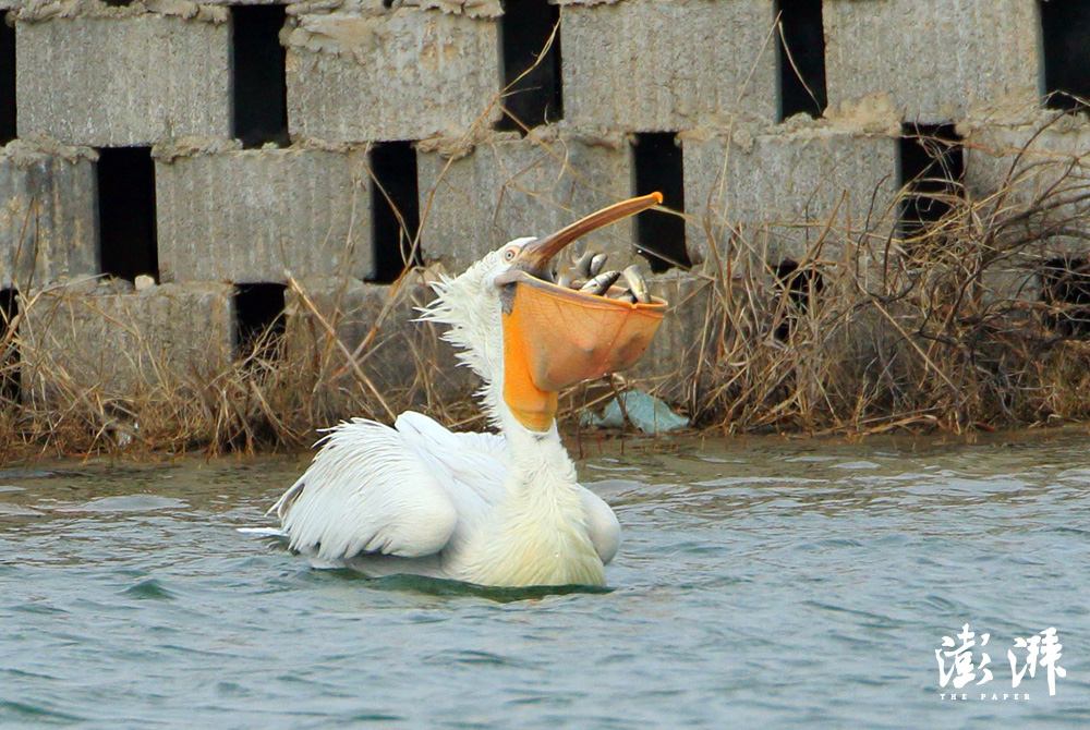 在杭州湾畔,一只卷羽鹈鹕捕获了好多鱼。