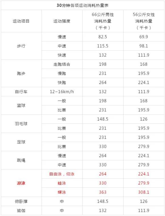 此外,在同等时间的运动中,游泳消耗的热量也是相对较高的。详情如下图: