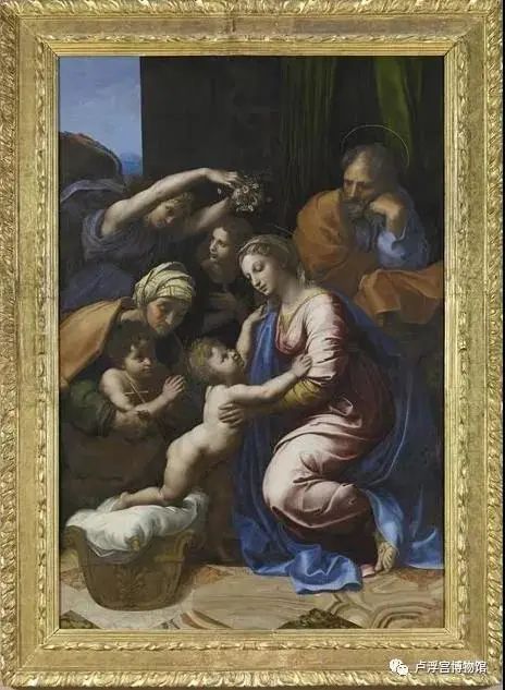 这幅由教皇订购作为礼物送给当时法国国王弗朗索瓦一世的作品,将国王一家人的形象暗藏在“圣家庭”的主题里,这是当时非常流行的创作方式,将个人形象与神圣性在画作中产生关联,深获艺术资助者的喜爱。