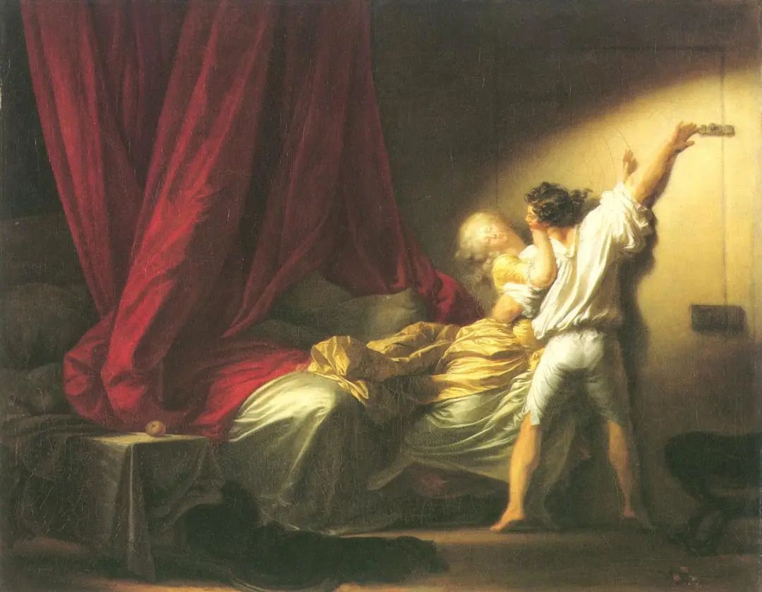布歇的学生让•奥诺雷•弗拉戈纳尔深受情色文学的影响,创作了大量描绘世俗情爱的作品,比如《门闩》表现的就是情色小说《夜晚与时刻》中的情节,年轻的男子一手拦腰抱住女子,一手拉上门上的插销。