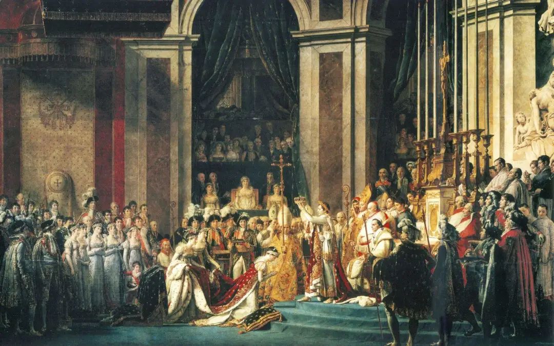 在拥戴拿破仑的艺术家中,最著名的便是大卫。他的《拿破仑的加冕典礼》,描绘了1804年12月拿破仑在巴黎圣母院举行盛大加冕仪式的场景。
