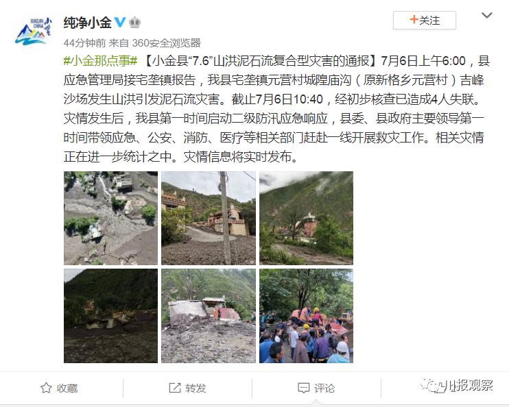 原标题:《突发!阿坝小金县暴发泥石流灾害,4人失联》