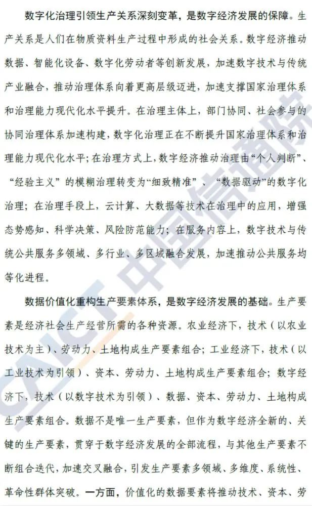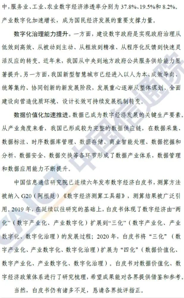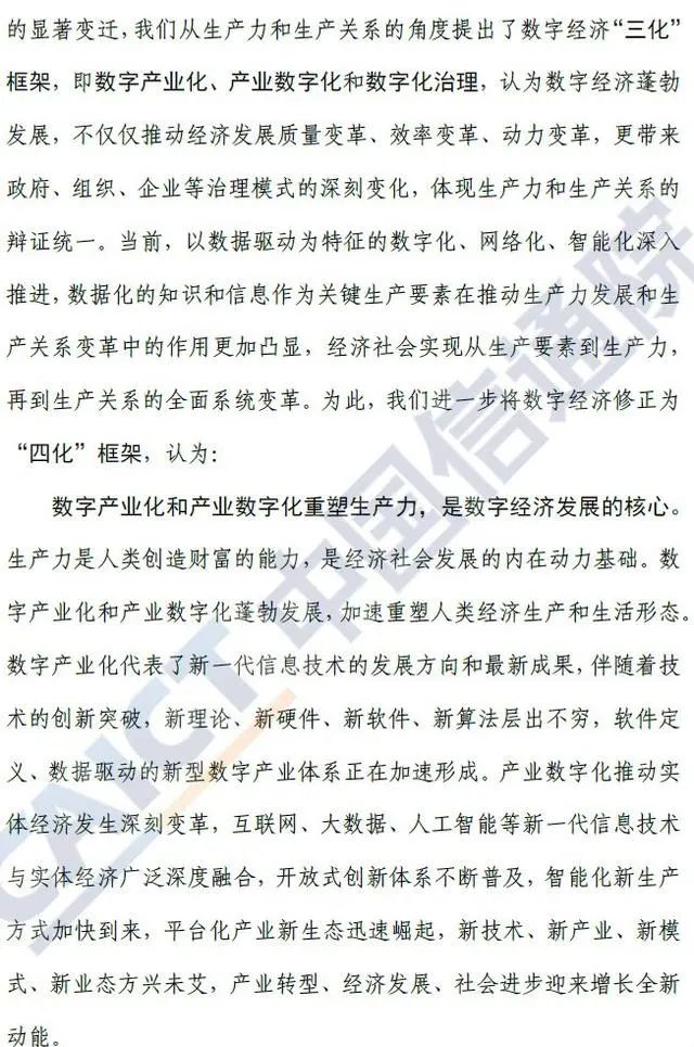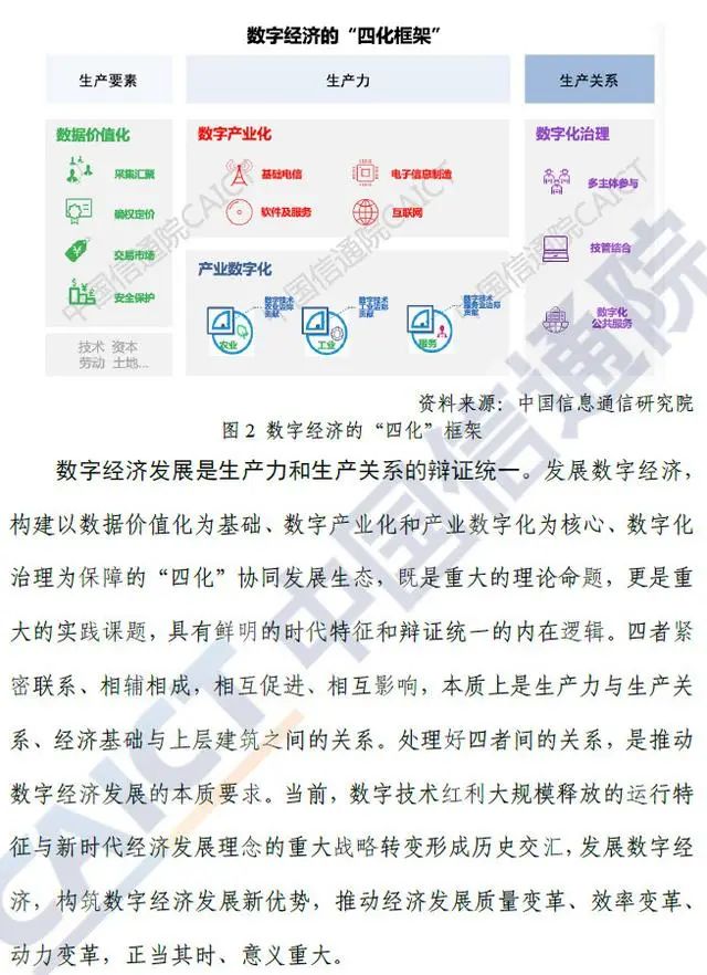 本报告还首次提出了数字产业化、产业数字化、数字化治理、数据价值化的“四化”数字经济框架。以下为报告详情: