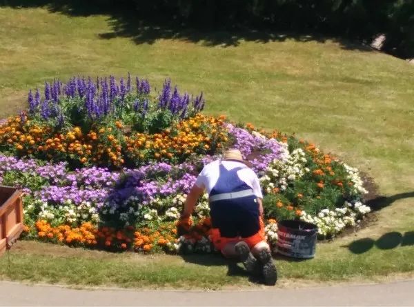 因为等候买箱子的人们,我在镇头的廊桥上呆了二十多分钟,一直望着那位花匠工作,不禁想到在这样的烈日下,我们成都的清洁工、园林工大多会在阴凉处躲着打瞌睡。必须声明,我绝没有批评我们工人的意思,他们很辛苦,我只是感叹这位老外花匠实在是太敬业了!