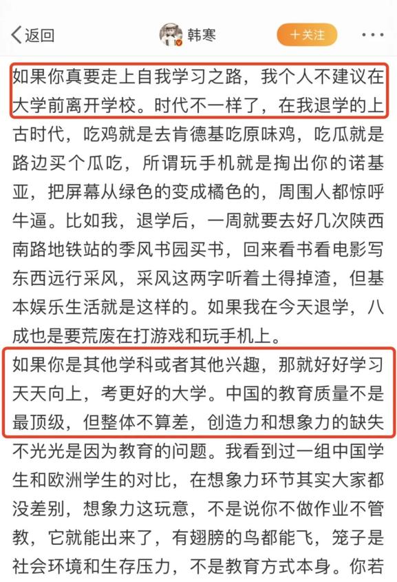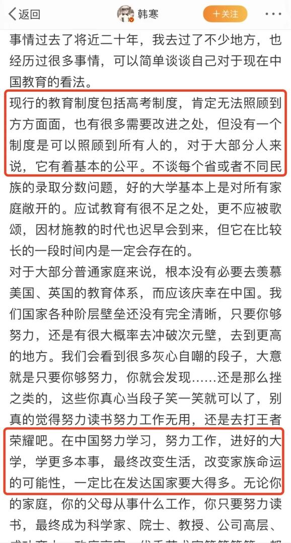 多年后,在“对抗”高考18年后,已经36岁的韩寒在文章《我所理解的教育》中写道: