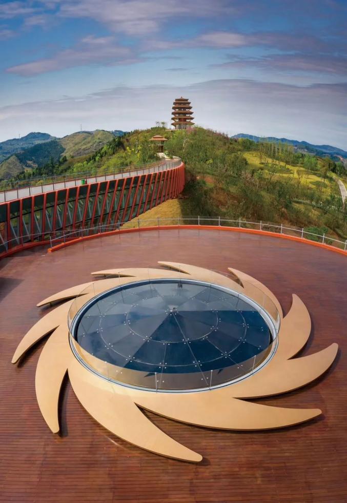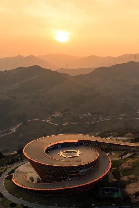 以亮眼的橙色外观为身体,螺旋而上的丹景台俯瞰如同一只神采闪动的眼睛,镶入中心的,是太阳神鸟金色的身影。