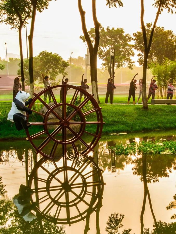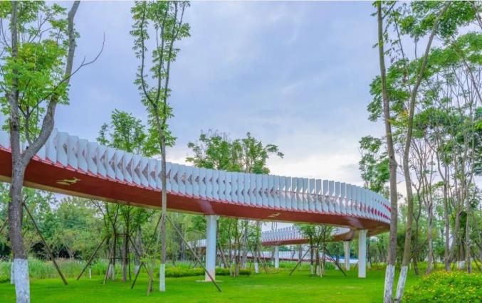 同时,如锦绣云彩飘扬在城市中轴线上的“锦云桥”、来自波兰罗兹市的《友谊环》雕塑等景观,以及自动售卖机、便利店、运动休息站等设施的完善,更突出着桂溪生态公园立于“城市”坐标上的现代化与设计感。