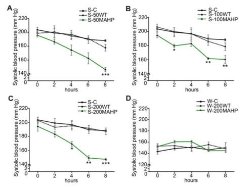 从图2可以看到:A图灌胃转基因水稻中提取的50 μg/kg剂量蛋白后,大鼠收缩压在0-8h内逐步稳态下降;B图灌胃100 μg/kg剂量同种蛋白后,大鼠收缩压在4h突然回升,后骤降,直到6h后下降放缓;C图灌胃200 μg/kg剂量同种蛋白后,大鼠收缩压在0-6 h内逐步稳态下降,6-8 h下降放缓;D图没有明显变化。