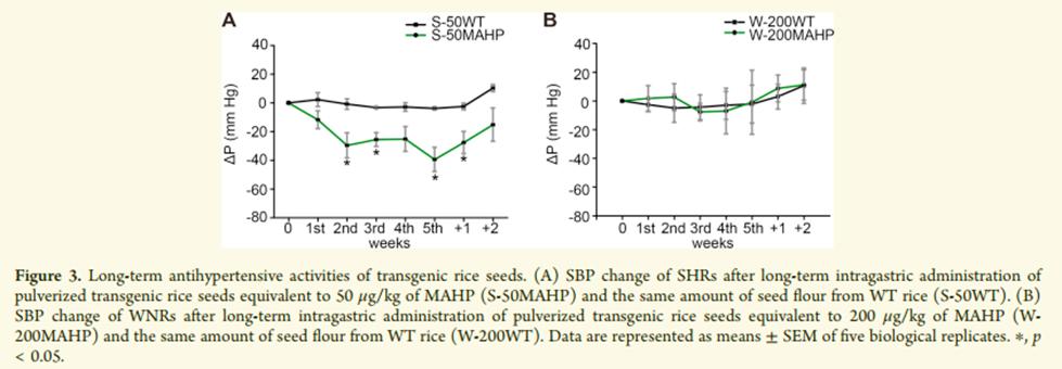 6月25日,来自中科院植物研究所的曲乐庆在Journal of Agricultural and Food Chemistry 上发表了一篇研究称,给高血压大鼠吃含血管紧张素转化酶抑制肽(ACEIPs)的转基因水稻,可显著降低血压,且没有明显的副作用。