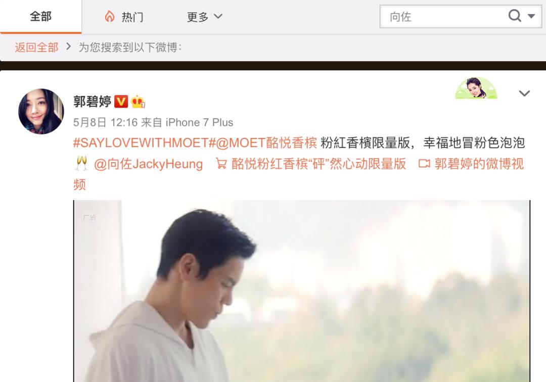 经考证,她其实只是设置了微博半年可见,能搜到向佐相关的,是一条商业推文。