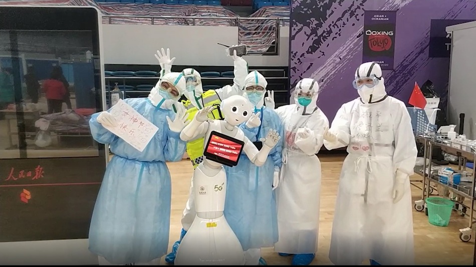 2、达闼科技打造的全国首个“智能方舱医院” 解决方案在“AI+医疗”展区集中亮相。新冠疫情防控期间,其清洁、消毒、安保等30多台智能机器人在湖北武昌方舱医院大展身手。
