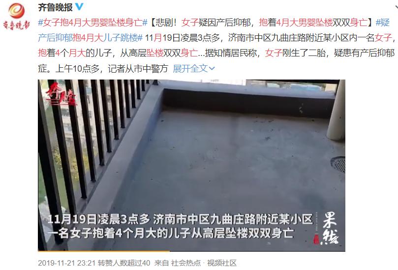 2019年11月19日,济南一女子抱着4月大的儿子跳楼,双双身亡。