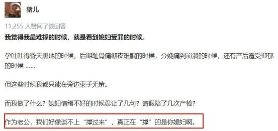 在知乎上有一个题为“老婆怀孕,作为老公的你是怎么撑过来的”。下面有很多用户的回答是这样的:没想过自己是怎么撑过来的,只在想老婆是怎么撑过来的。