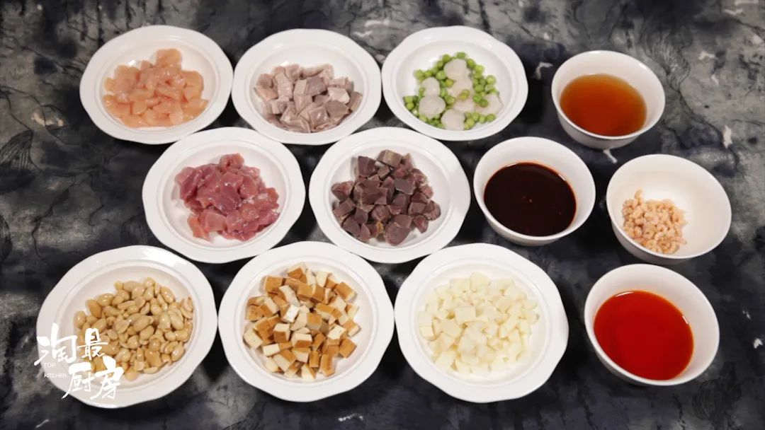 先将猪腿肉、鸡肉、鸭胗、猪肚(各3勺)焯水,然后再加入笋丁和豆干(各3勺)焯水。