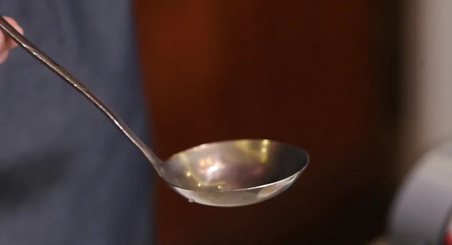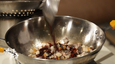 锅中加入1/3火锅勺油(一定要热锅冷油哦!),随后倒入食材,再加入1/4火锅勺黄酒,炒到食材飘出香味就可以加入德兴馆的秘制酱料了。