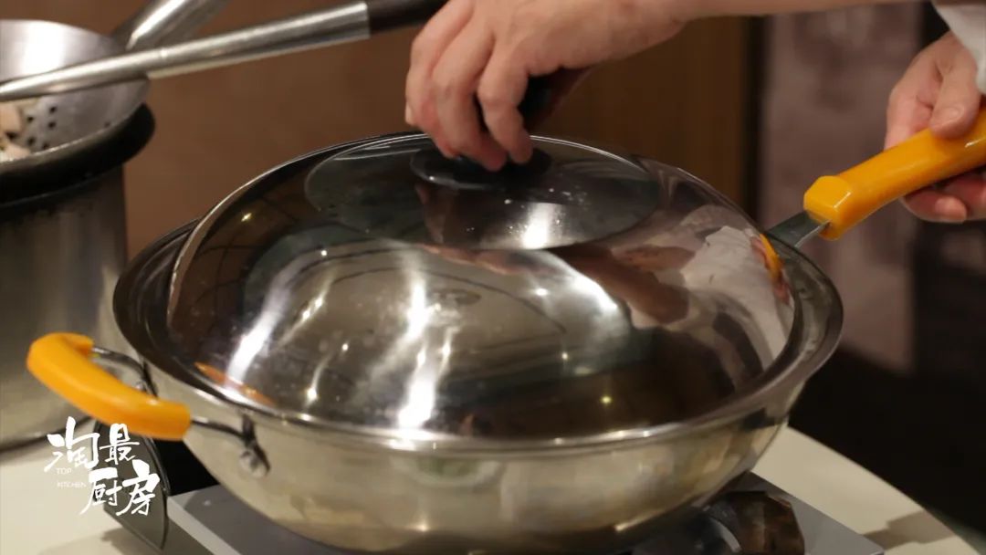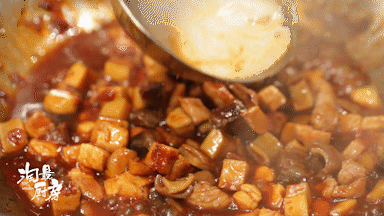 加入调制完的酱料,炒到酱汁油亮冒小泡(这时酱汁的香味已经飘香四溢了),随后加盖小火焖1分钟,让食材更加入味。