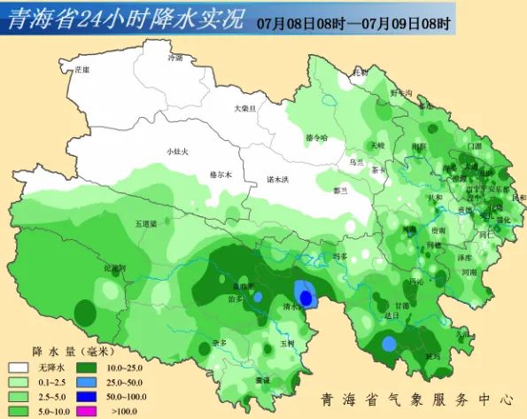 08日08时-09日08时,全省749个测站中,有597个出现了降水。降水中心:称多清水河镇巴颜喀拉山,57.7毫米(注:降雹导致有滞后降水产生);城镇最大降水:兴海,38.1毫米;西宁,8.4毫米。