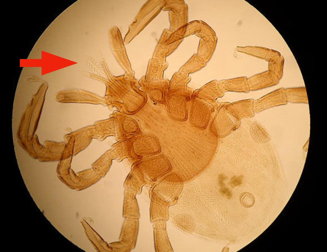 3.蜱虫的口器是由两对鳌足和中间的垂唇构成。蜱虫刺入皮肤吸血的是垂唇,它是锯齿状的。