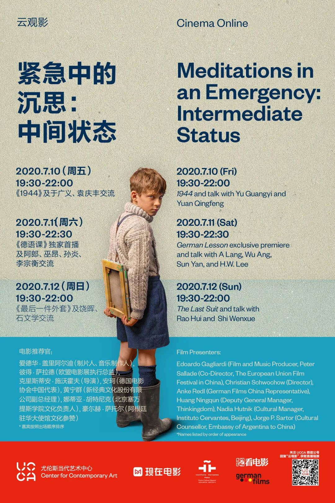 2、观影领福利,干货收不停!以#UCCA云观影# 为标签,为观看的影片写下你的所知所感,并@UCCA尤伦斯当代艺术中心 和 @现在电影 @看电影 @德国电影学会 @北京塞万提斯学院 @新经典官方微博。每部电影的精彩影评中,我们将挑选3名幸运观众,送出“UCCA x现在电影”联名布包、30元现在电影观影券、德国电影协会小周边一份。其中,参与《德语课》的影评观众,除了获得以上三样福利之外,还将获得《看电影》杂志和《德语课》小说;参与《最后一件外套》的影评观众,除了获得以上三样福利外,还将获得北京塞万提斯学院的布包、本子、小画册等,幸运名单将在公布在@UCCA尤伦斯当代艺术中心 和 @现在电影的微博,以及“UCCA艺术通讯”和 “现在电影”微信公众号的文末,届时可联系【云小P】咨询领奖事宜。